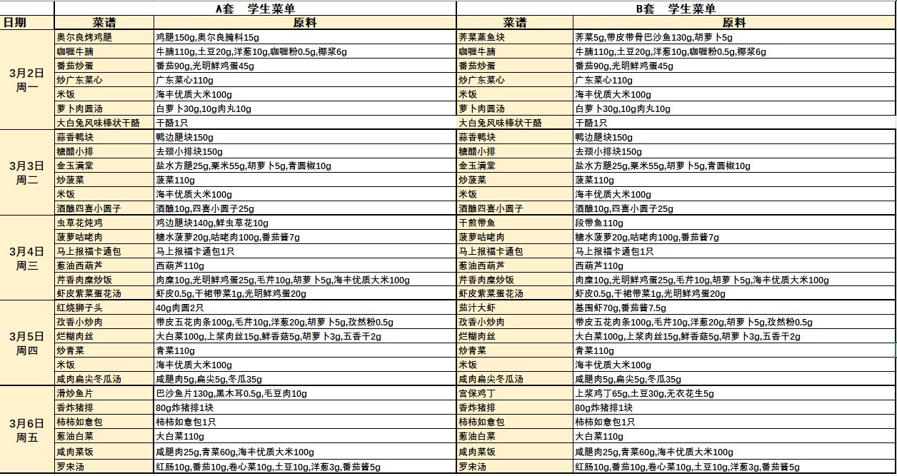 2025学年第二学期学生营养午餐菜单(第一周)