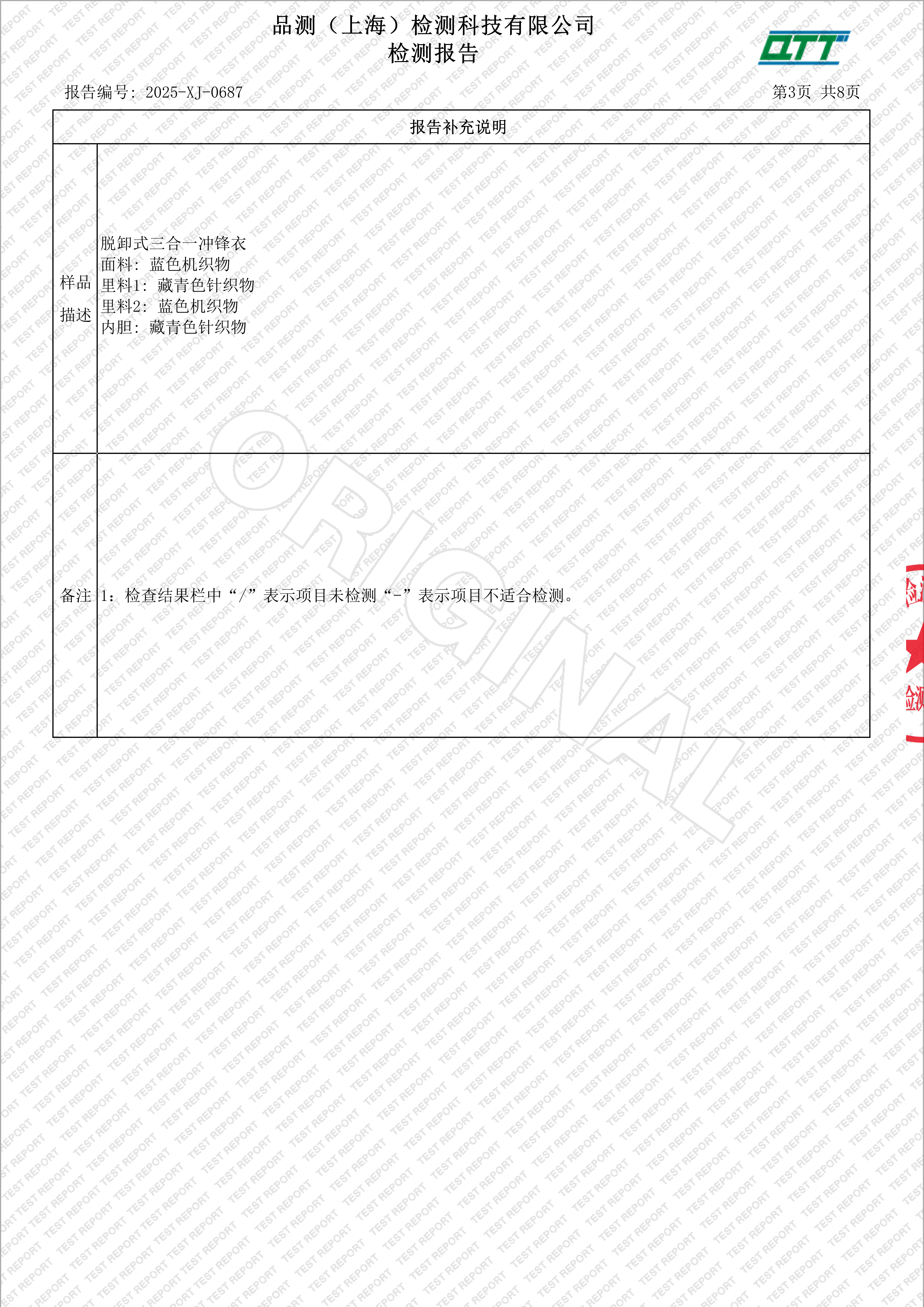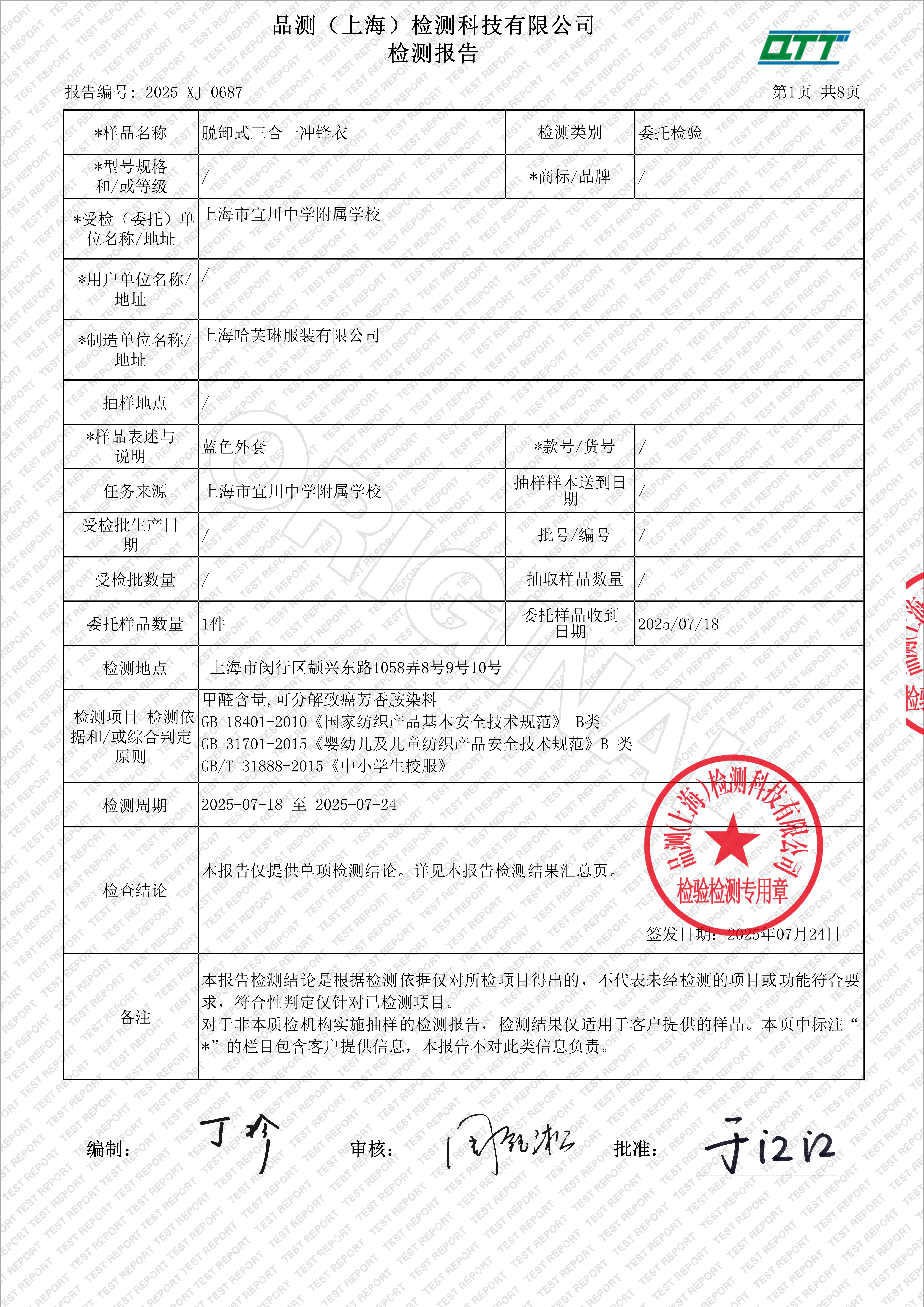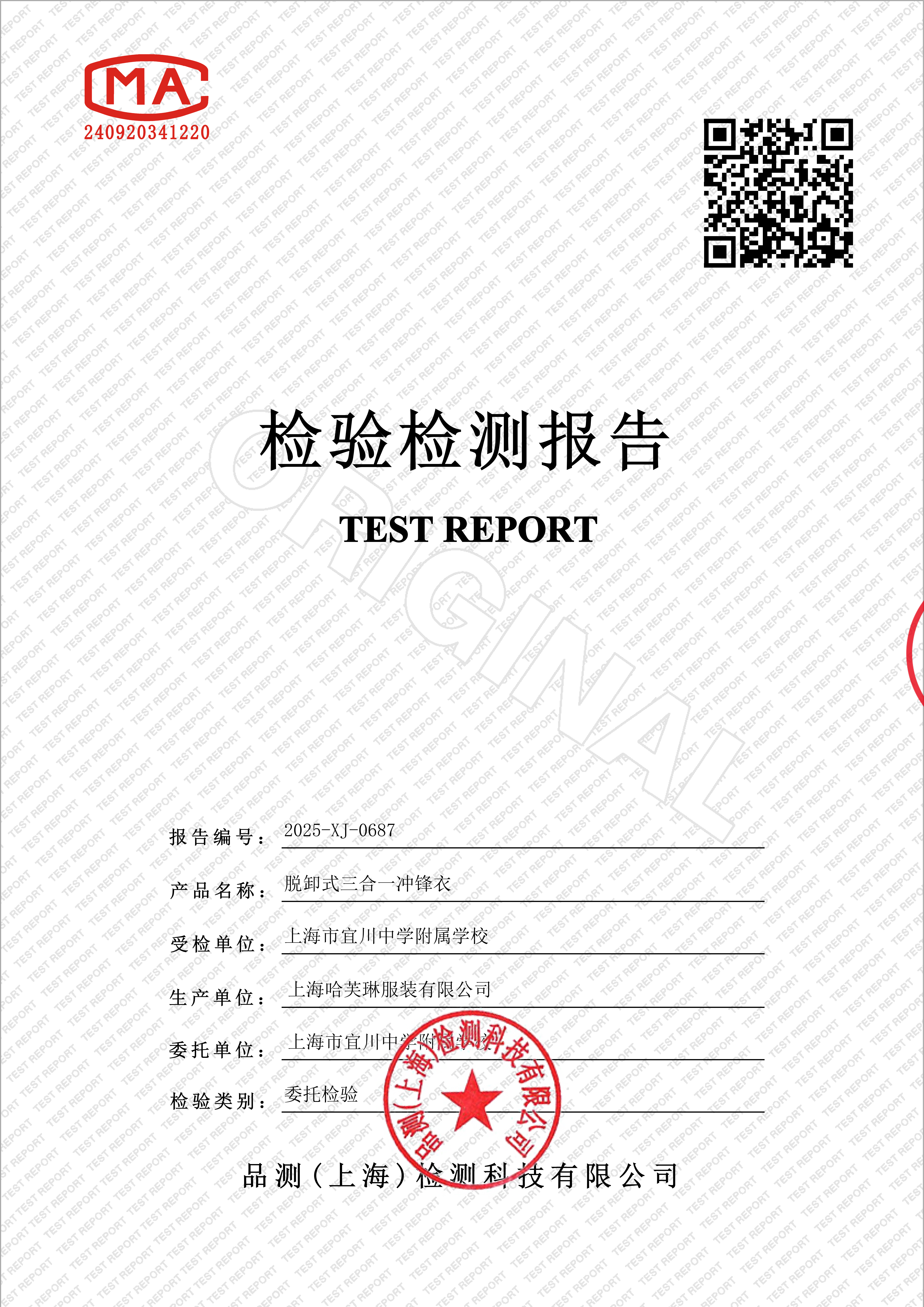 上海市宜川中学附属学校校服二次检验检测报告(脱卸式三合一冲锋衣)