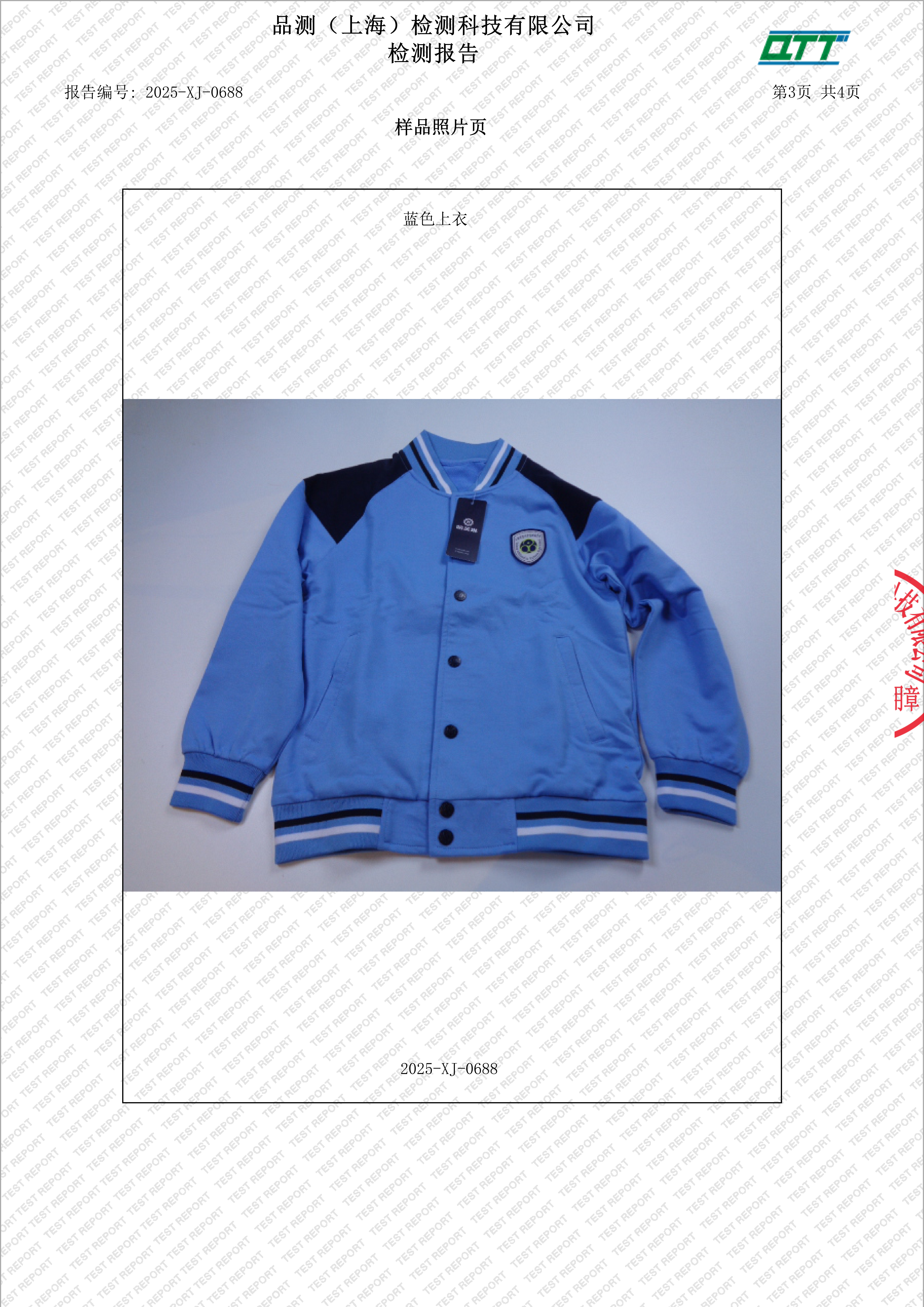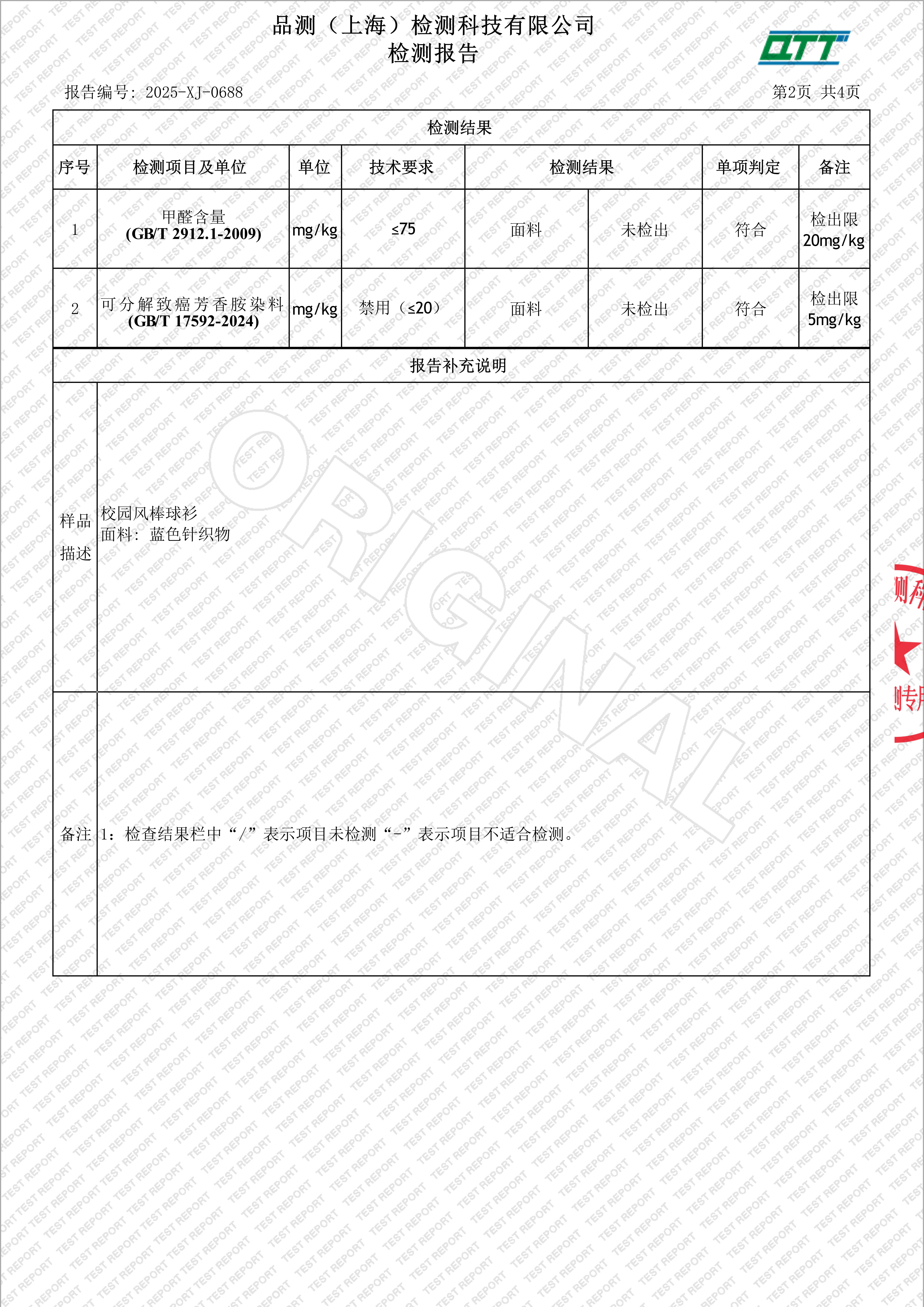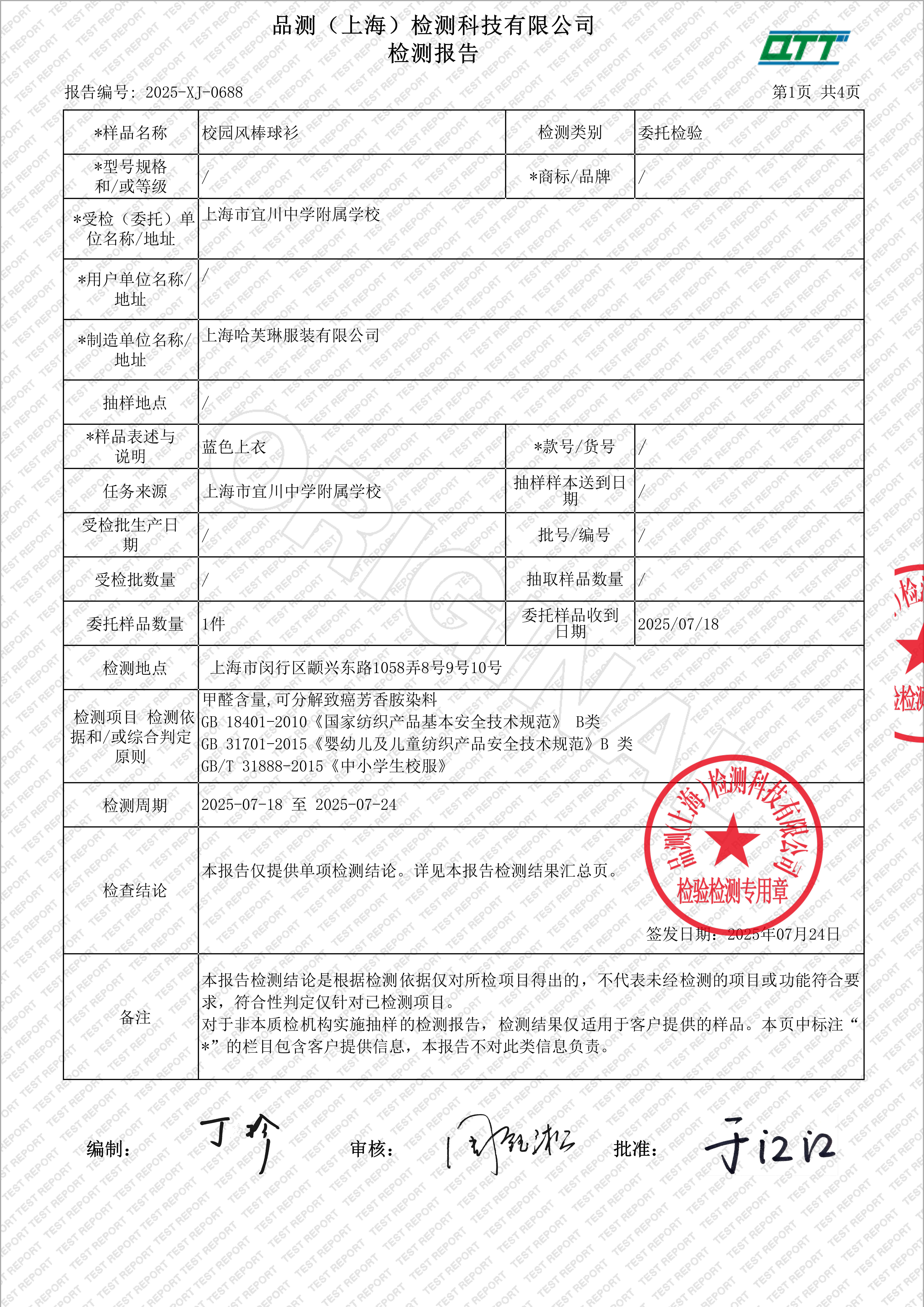 上海市宜川中学附属学校校服二次检验检测报告(校园风棒球衫)