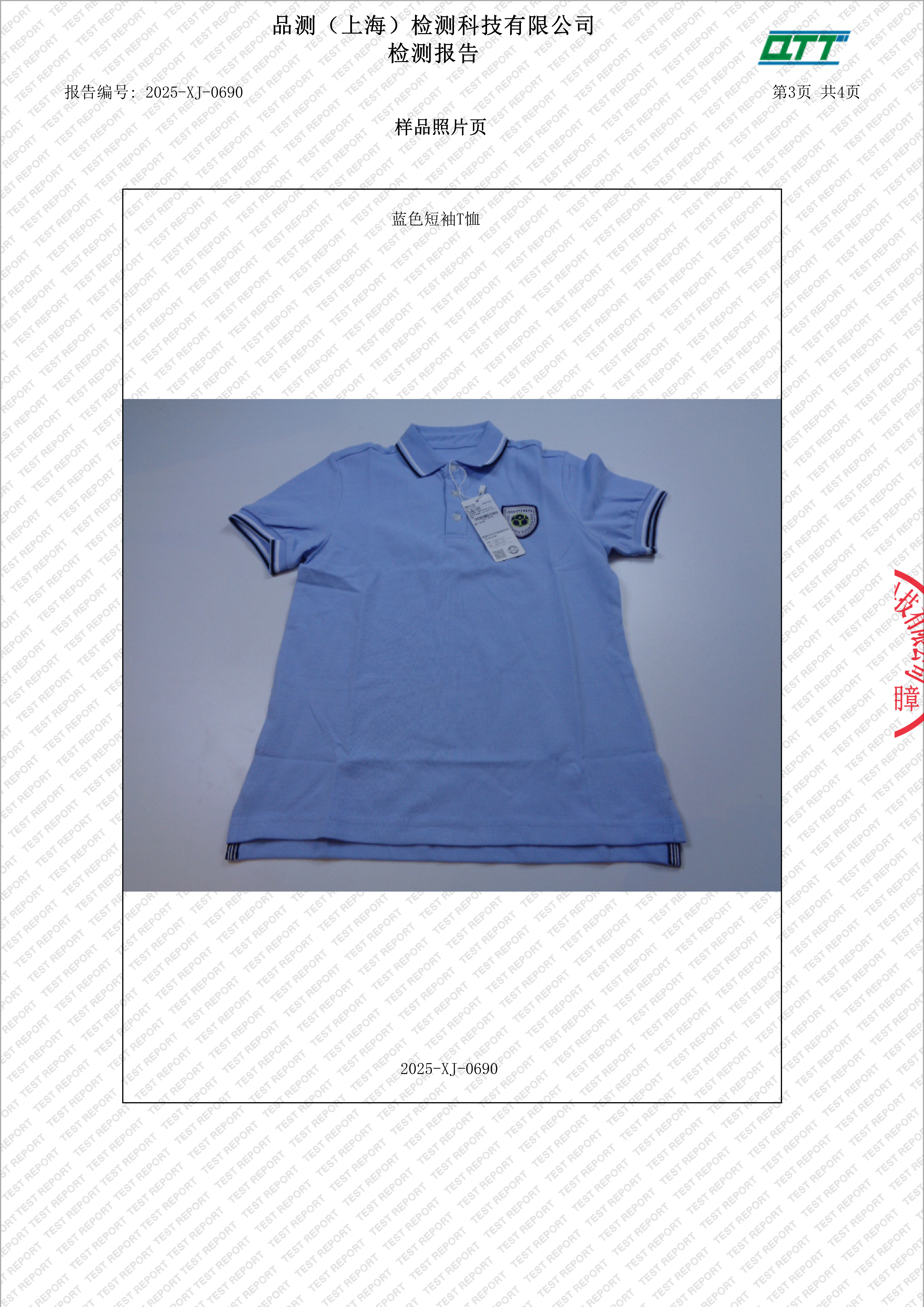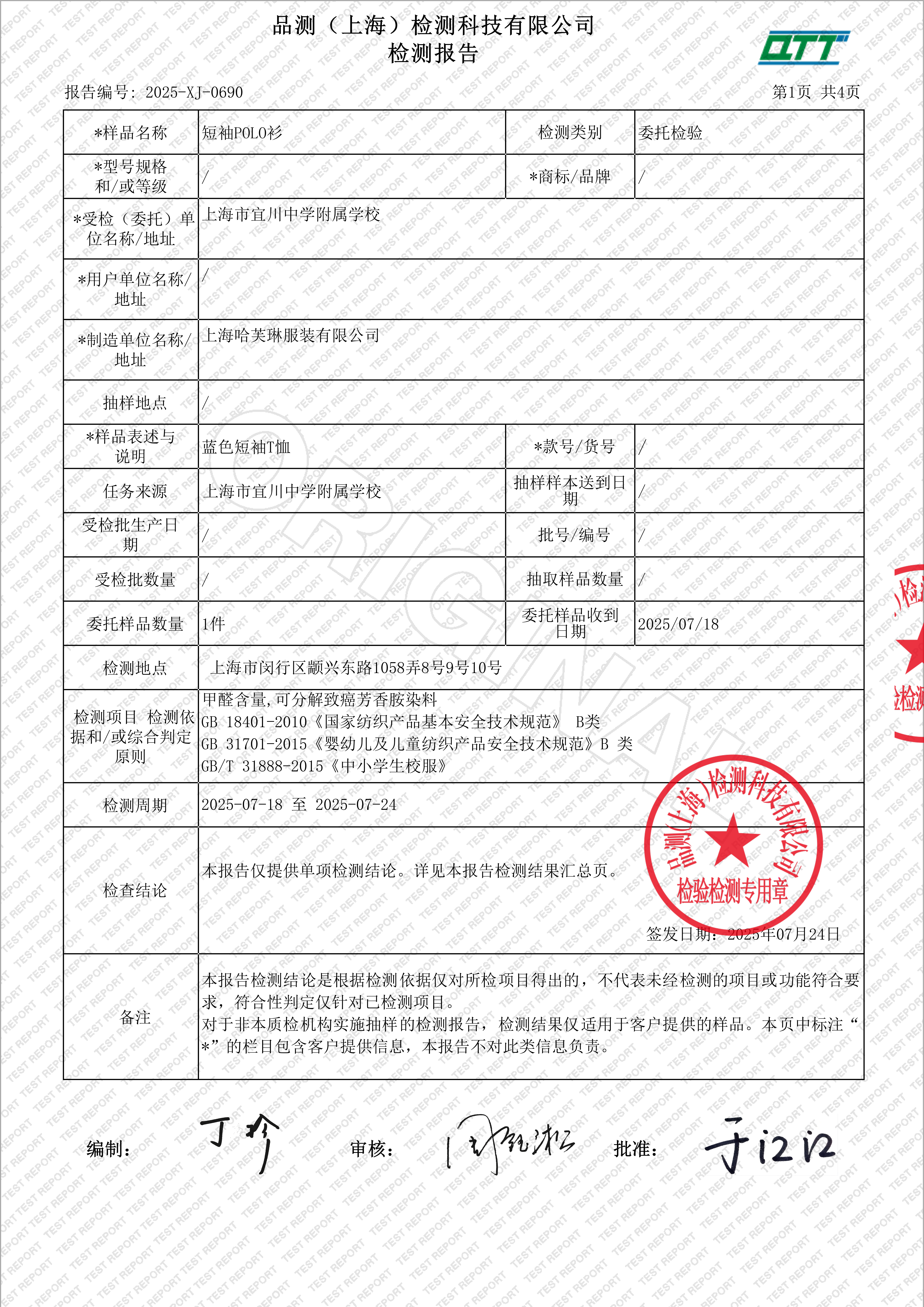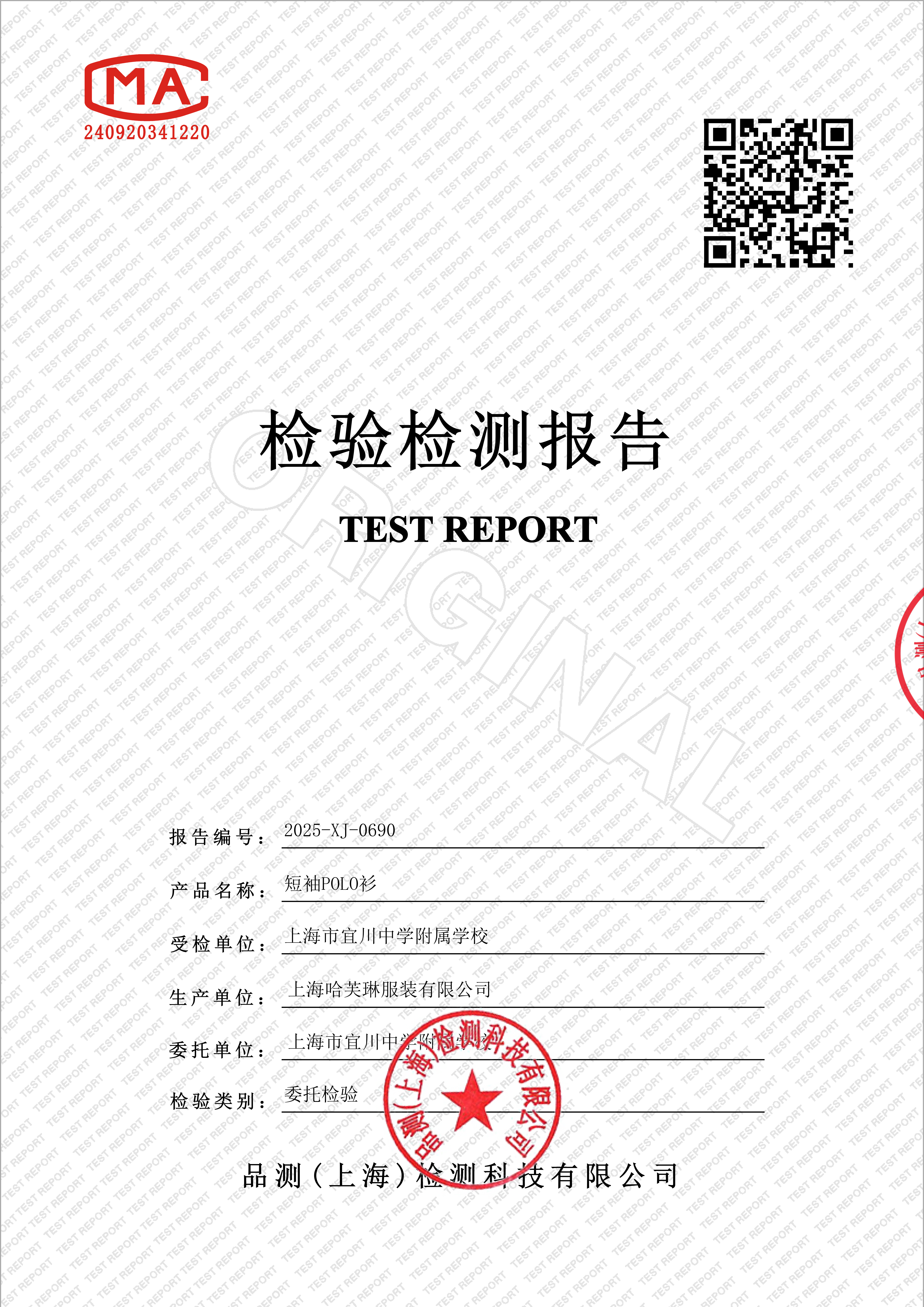 上海市宜川中学附属学校校服二次检验检测报告(短袖POLO衫)