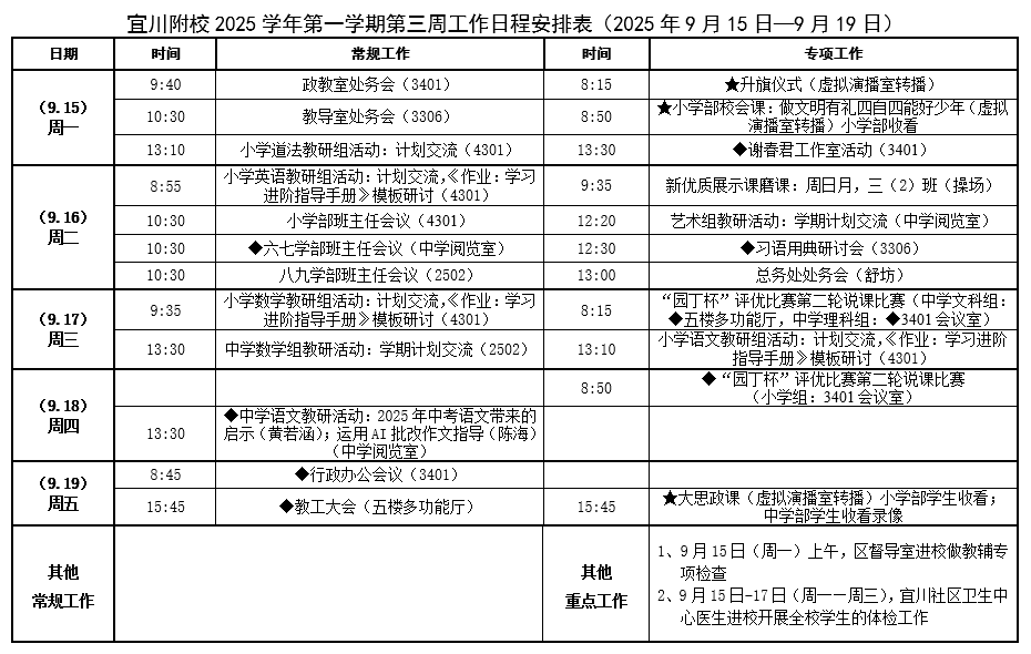 宜川附校2025学年第一学期第三周工作日程安排表