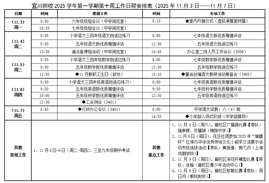 宜川附校2025学年第一学期第十周工作日程安排表