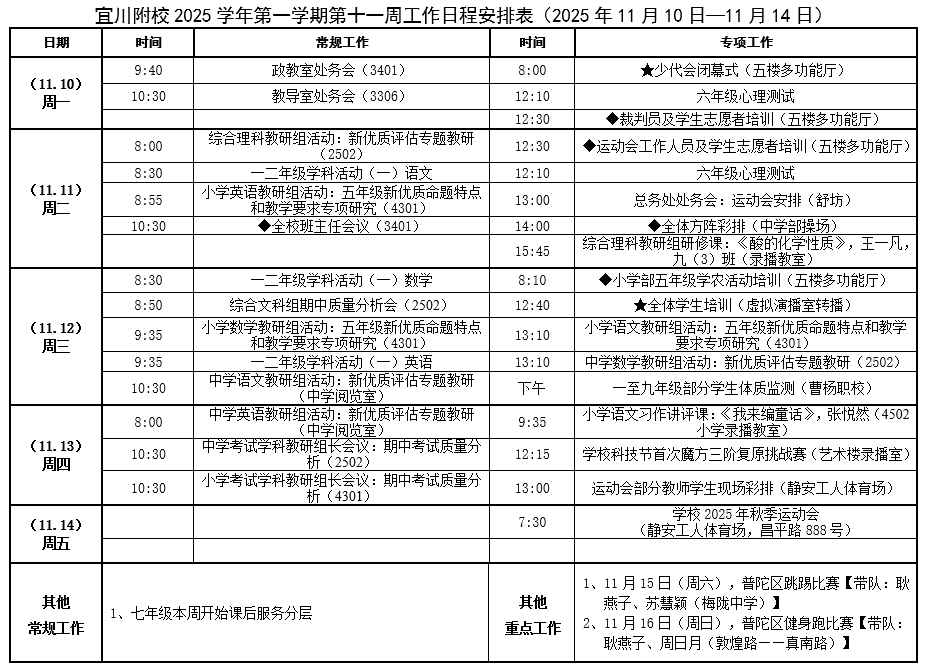宜川附校2025学年第一学期第十一周工作日程安排表