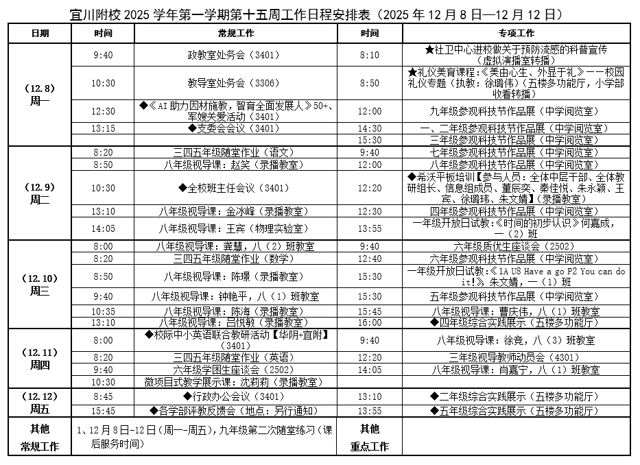 宜川附校2025学年第一学期第十五周工作日程安排表