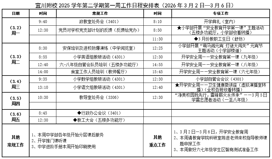 宜川附校2025学年第二学期第一周工作日程安排表
