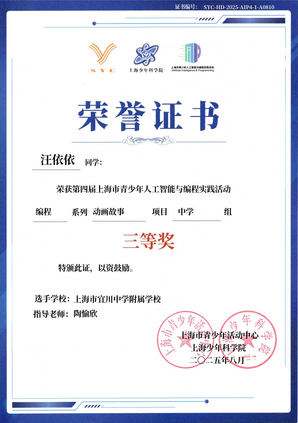 汪依依同学多才多艺,喜欢画画、弹琴,爱好体育活动。曾担任过大队主席的她从不骄傲,勤勤恳恳学习,踏踏实实工作,是同学们学习的好榜样。2025年,她更以优异成绩通过英皇(ABRSM)八级考试。曾荣获第66届高天国际钢琴比赛二等奖;2025年普陀区学生绘画书法摄影作品比赛和展览三等奖;2025年上海市学生艺术单项比赛普陀区赛钢琴三等奖;普陀区第二十三届“少年城杯”中小学生模型大赛车辆模型竞赛电动直线车三项全能竞速赛(团体)三等奖;2025年第十一届上海创客新星大赛普陀区活动结构挑战二等奖;普陀区第四十二届“浪花杯”中小学生模型大赛车辆模型竞赛太阳能动力车模型直线竞速赛三等奖。