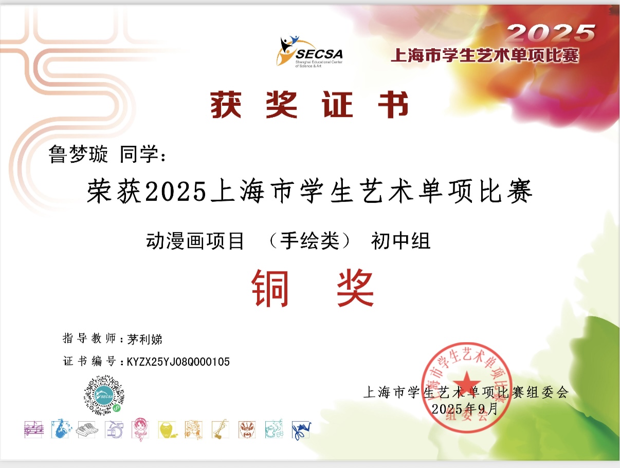 鲁梦璇同学乐观开朗,作为大队委员,她平易近人,时刻做好表率作用。在班中,她乐于助人,是老师的好帮手。她多次被评为校“四自好少年”。获得了社会艺术水平考级软笔书法6级和硬笔书法5级;CEFA爵士舞2级;中国美术学院社会美术水平考级速写6级等证书等。曾荣获“中文自修杯”第六届上海市小学生“美丽汉字”征文区级活动(普陀区)三年级三等奖;“中文自修杯”第七届上海市小学生“美丽汉字小达人”区级活动四年级一等奖;普陀区第二十届“少年城杯”中小学生模型大赛建筑模型竞赛项目现代建筑模型设计制作赛小学组二等奖;2021年普陀区学生艺术单项比赛动漫画项目小学组银奖;“中文自修杯”第八届上海市小学生“美丽汉字小达人”区级活动(普陀区)五年级一等奖;2022年全国青少年科技模型网络系列竞赛JZ-G2类中国传统建筑模型设计制作赛(小学组)第三赛段二等奖;2022年普陀区学生艺术单项比赛动漫画小学组铜奖;2023普陀区学生艺术单项比赛初中组动漫三等奖;第二十二届上海市青少年计算机应用操作竞赛(明信片设计初中组)一等奖;2025年第56个世界地球日普陀区中小学电脑小报、绘画作品宣传活动绘画作品二等奖;2025上海市学生艺术单项比赛普陀区赛动漫画手绘类初中组一等奖等。她的作品《亲子陪伴好时光》,在2024年普陀区儿童青少年心理健康亲子海报创新设计比赛中脱颖而出,并被录用。
