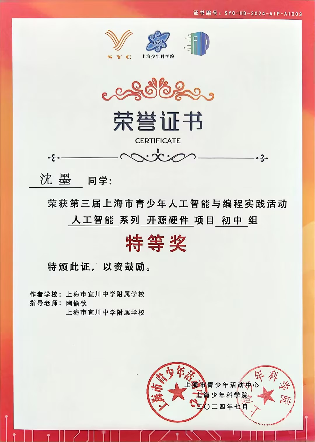 沈墨是个积极开朗的学生。他尊敬师长,曾获得普陀区“金孝心”少年称号。他关心集体,热衷于为集体贡献力量。他兴趣爱好广泛,喜欢打鼓、主持、演讲、游泳、编程等,积极参加学校组织的各项活动。曾荣获第36届上海市青少年科技创新大赛二等奖;“雏鹰杯”红领巾科创达人三等奖;2021年全国中小学信息技术创新与实践大赛(NOC)复赛小学高年级组二等奖;第二十一届上海市青少年计算机应用操作竞赛暨普陀区选拔赛智能移动二等奖;第二十一届上海市青少年计算机应用操作竞赛(移动应用开发初中组)三等奖;第四届(2023-2024学年)全国青少年科技教育成果展示大赛上海市区域赛GoC编程挑战赛二等奖;2024年普陀区中小学生机器人科学实践活动机器人绕障竞速二等奖等荣誉。