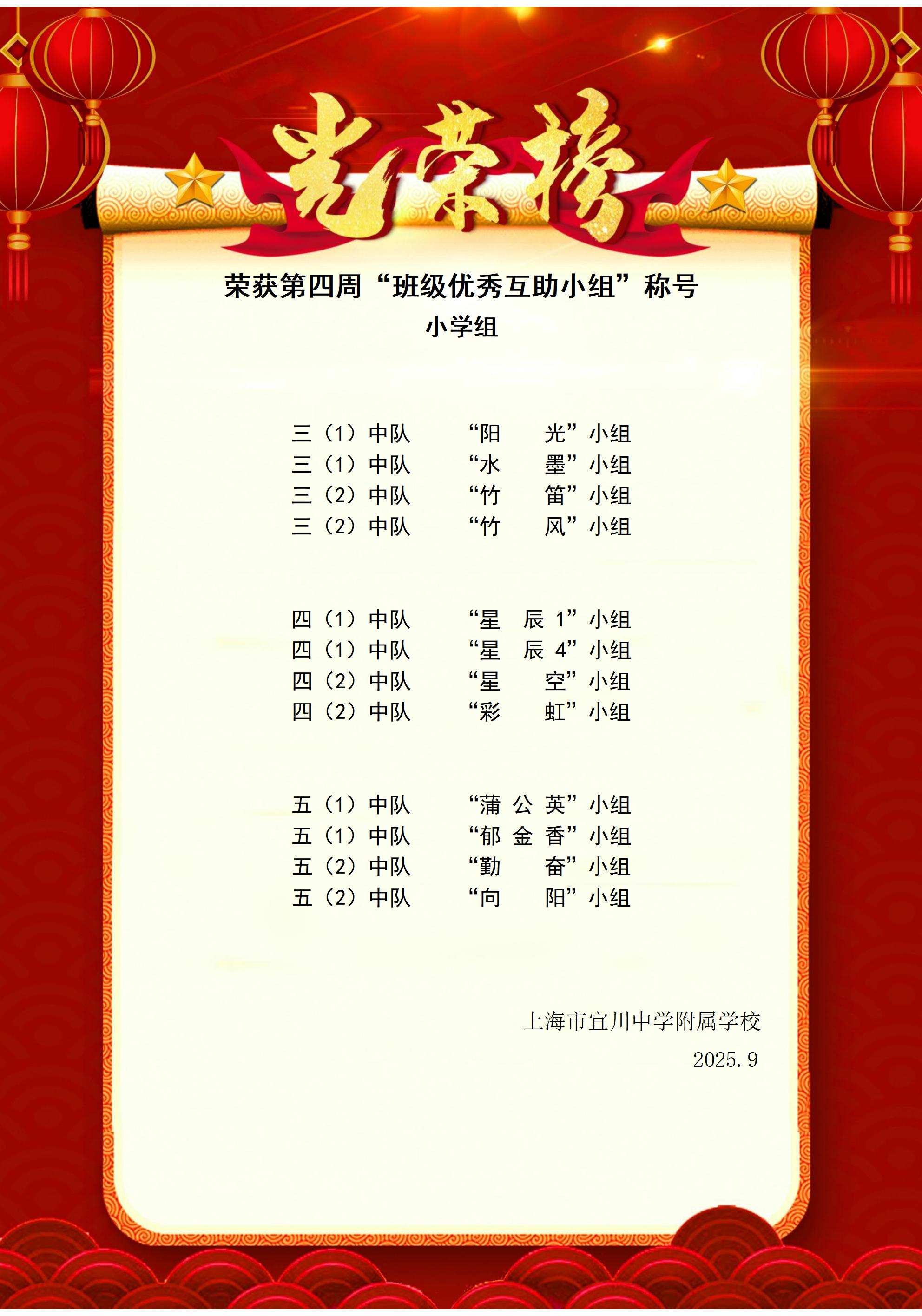 2025学年第一学期荣获第四周“班级优秀互助小组”称号名单
