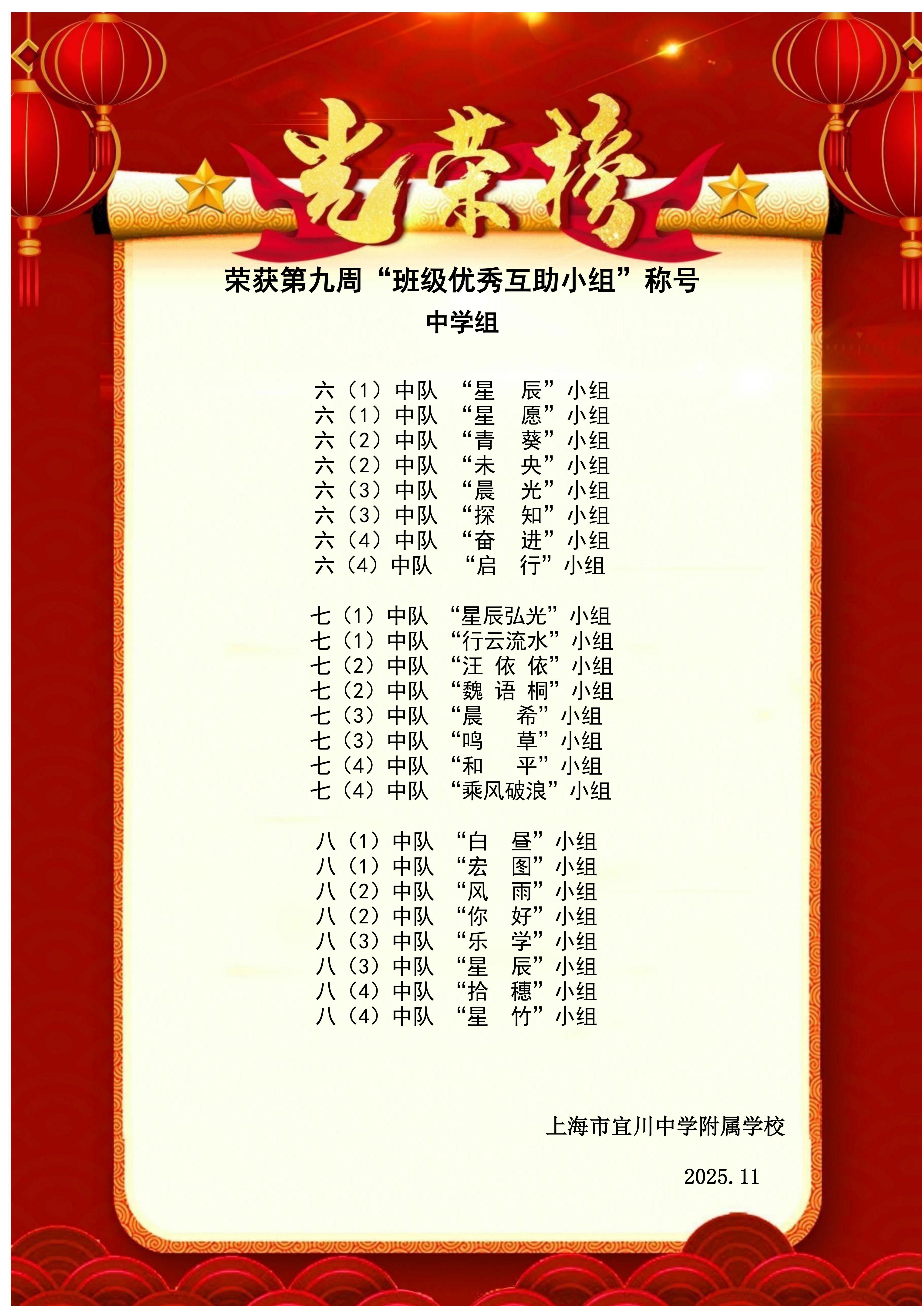 2025学年第一学期荣获第九周“班级优秀互助小组”称号名单